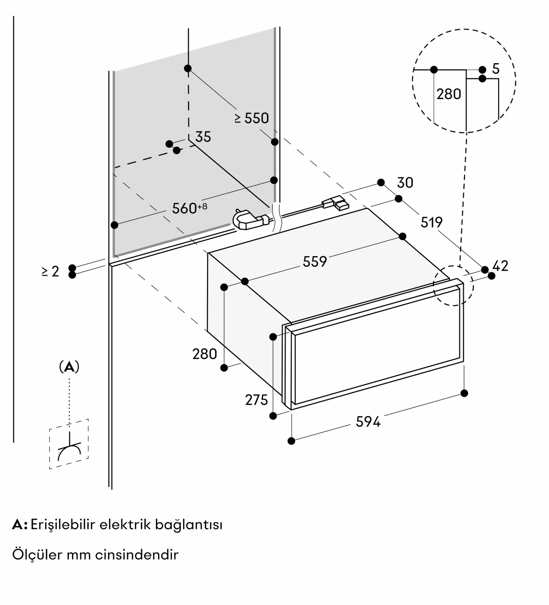 Şebeke prizi erişilebilir olmalı ve yerleşik nişin dışında bulunmalıdır.