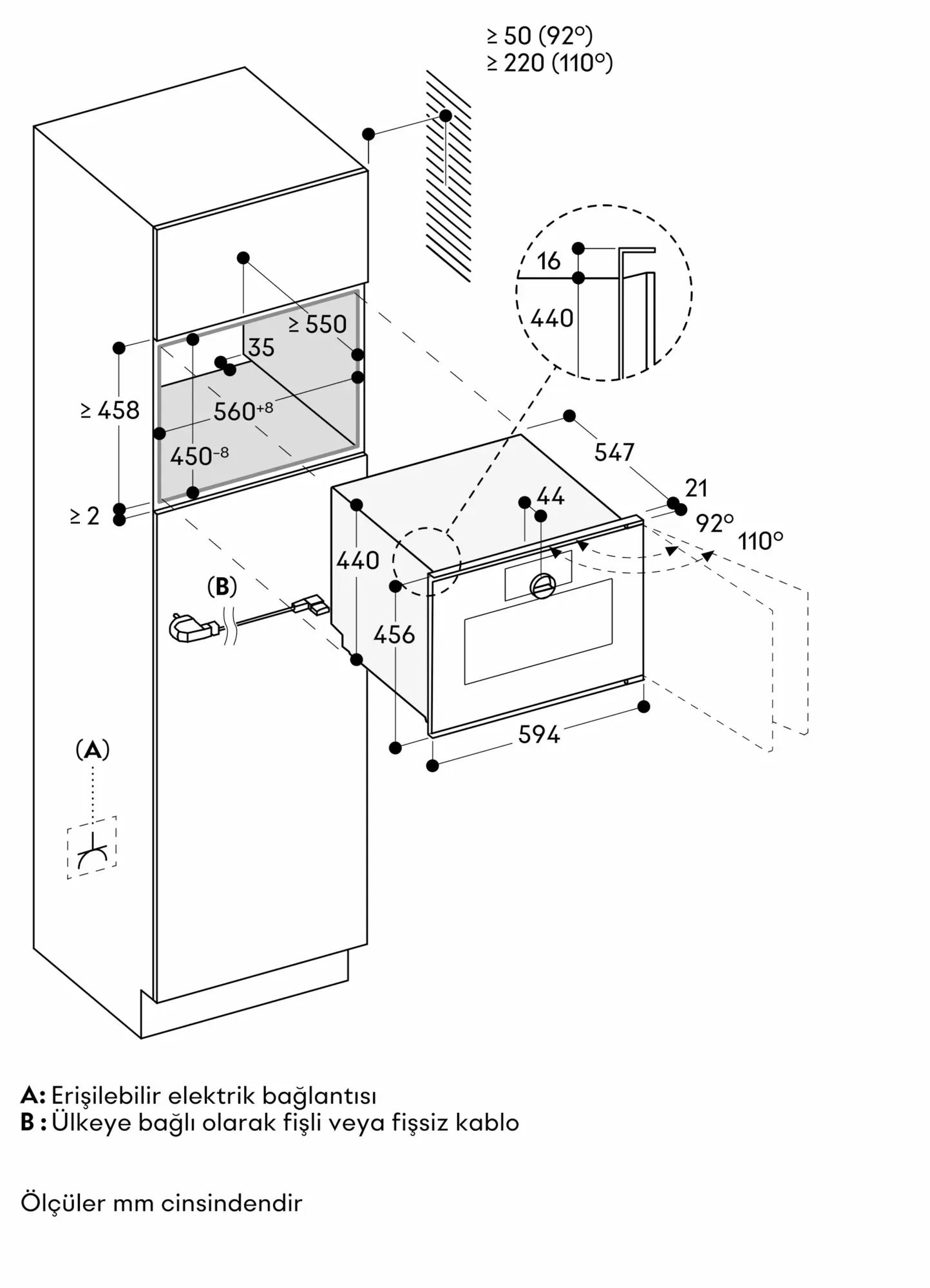 Şebeke prizi erişilebilir olmalı ve yerleşik nişin dışında bulunmalıdır.