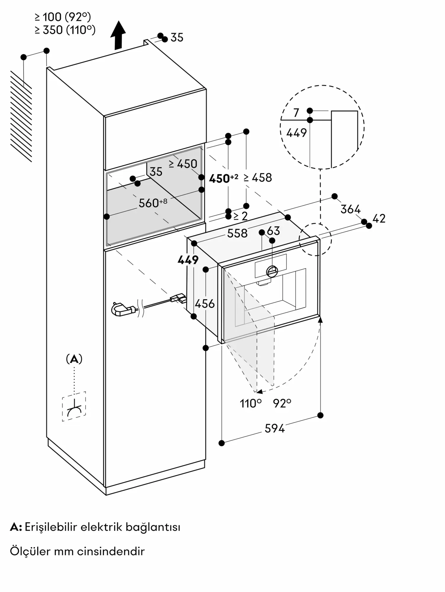 Kapı açılma açısı yaklaşık 92° - duvara montaj mesafesi en az 100 mm olmalıdır (yedek parça No. 10020041).