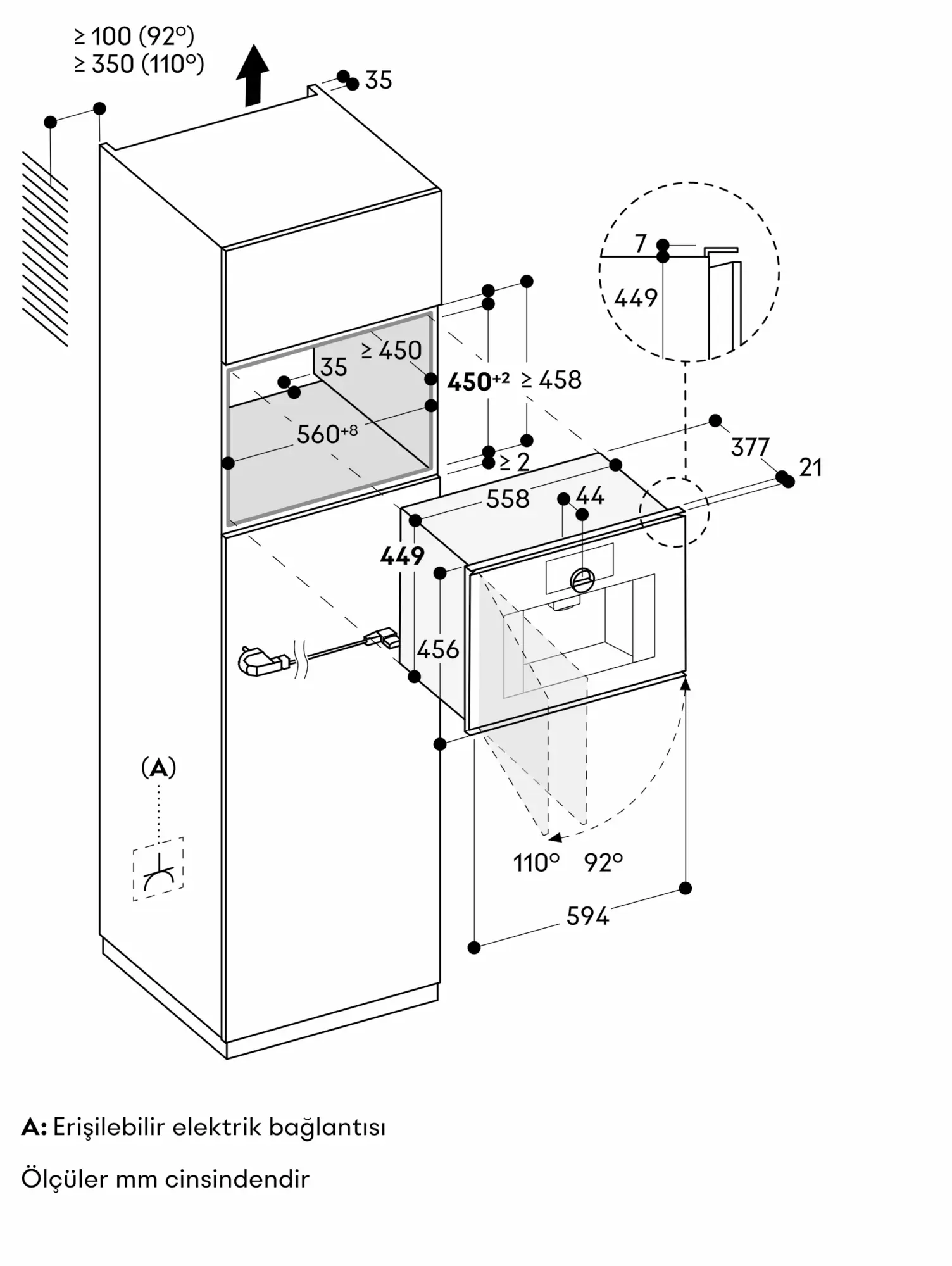 Kapı açılma açısı yaklaşık 92° - duvara montaj mesafesi en az 100 mm olmalıdır (yedek parça No. 10020041).