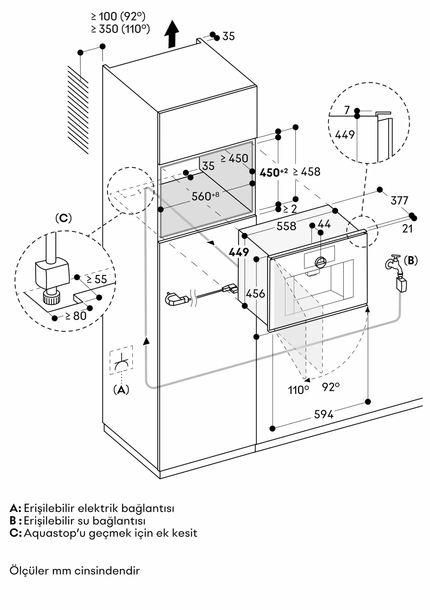 Kapı açılma açısı yaklaşık 92° - duvara montaj mesafesi en az 100 mm olmalıdır (yedek parça No. 10020041).