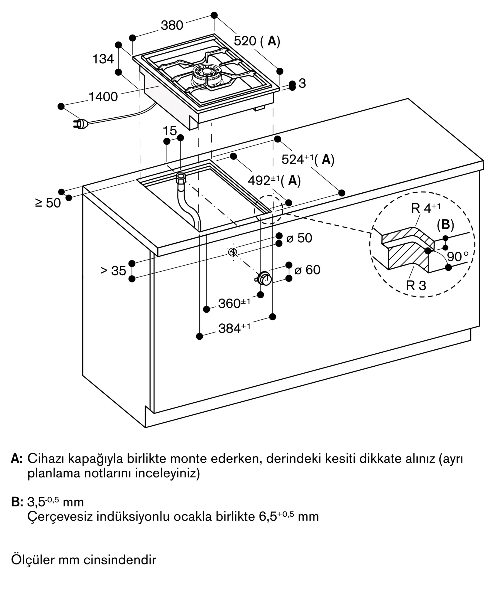 Montaj şekline göre (tezgah üstü veya hemyüzey), tezgah kesim ölçüsü ve düğme konumları değişebilir.