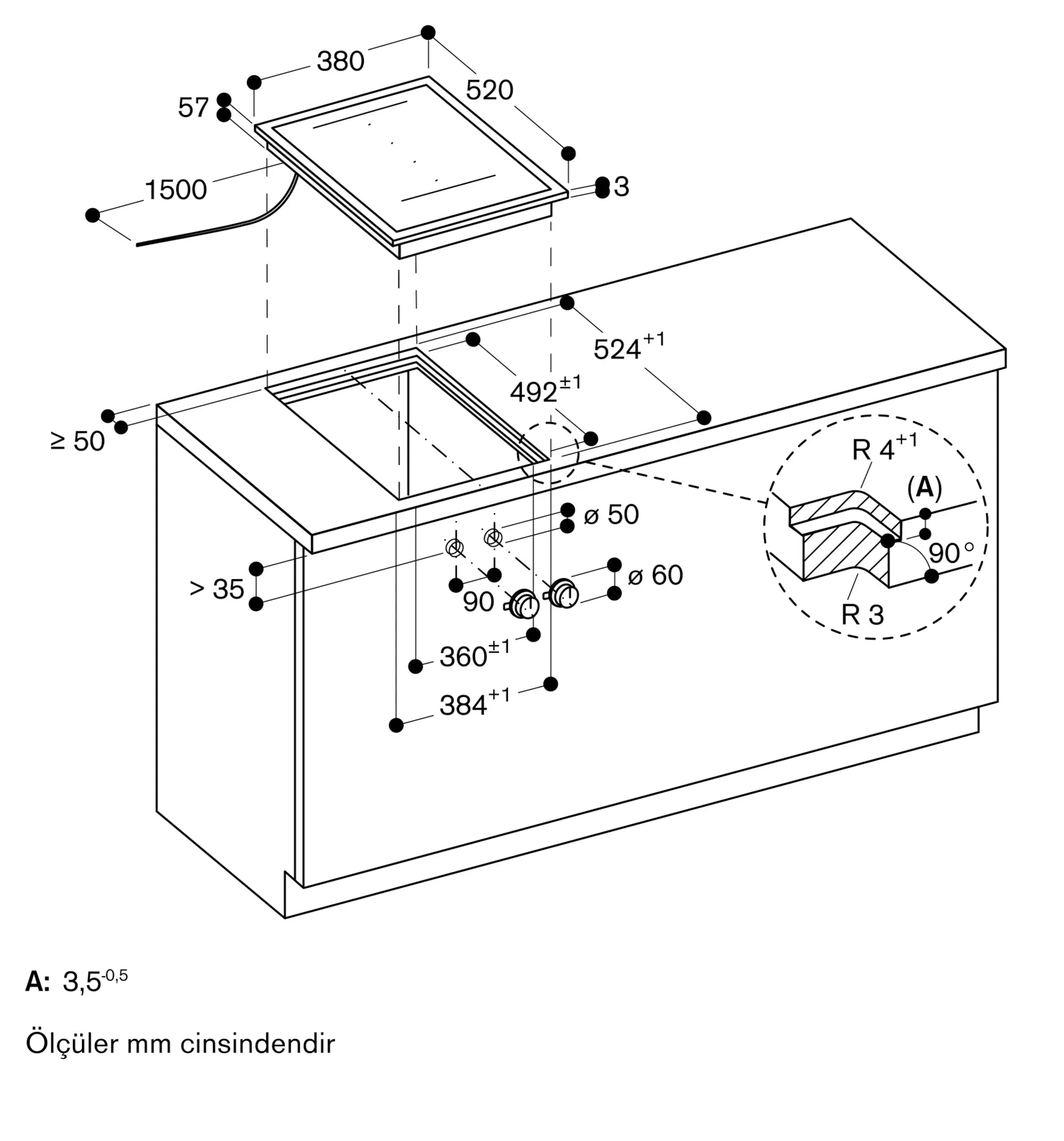 İsterseniz tezgahüstü yada tezgah ile hemzemin montaja uygun. Ankastre ediliş biçimine göre tezgah kesitine ve düğme konumlandırmalarına dikkat ediniz.