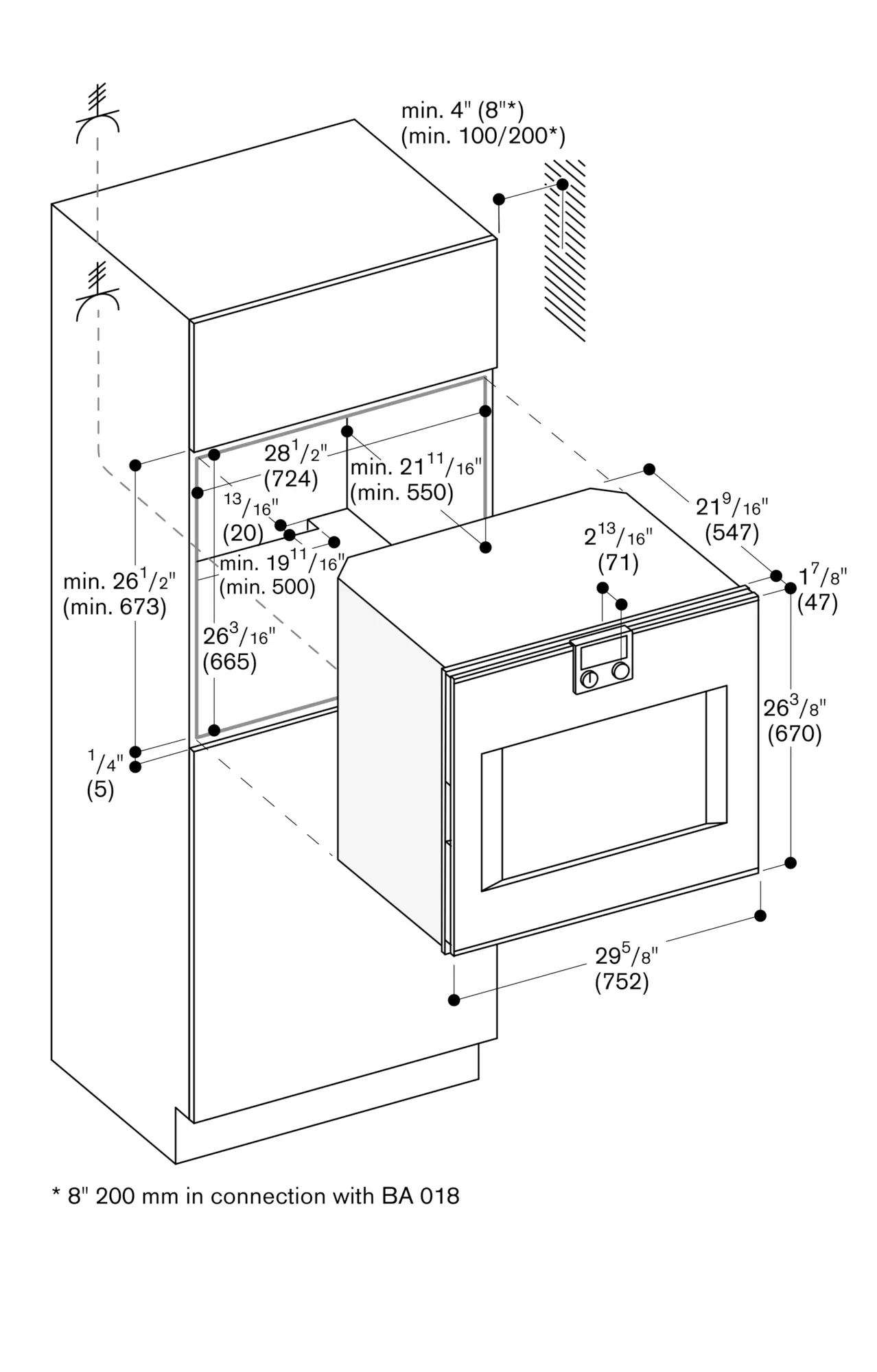 Consider the overhang, incl. the door handle where applicable, when planning to open drawers next to the appliance.