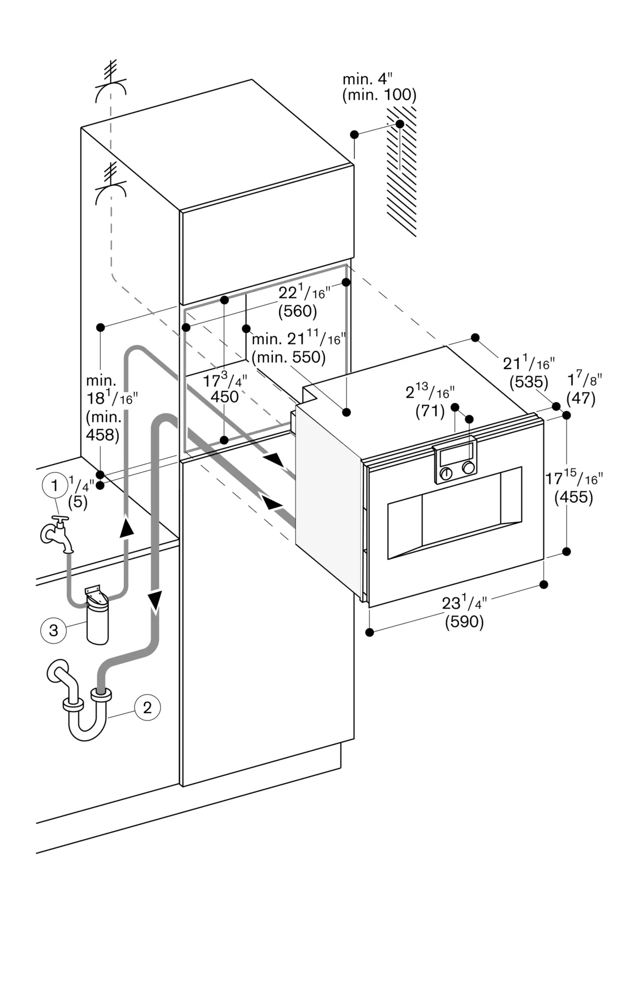 To achieve the 21 5/8" (550 mm) installation depth, the water hoses and connection cable needs to follow the slanted edge on the corner of the housing.