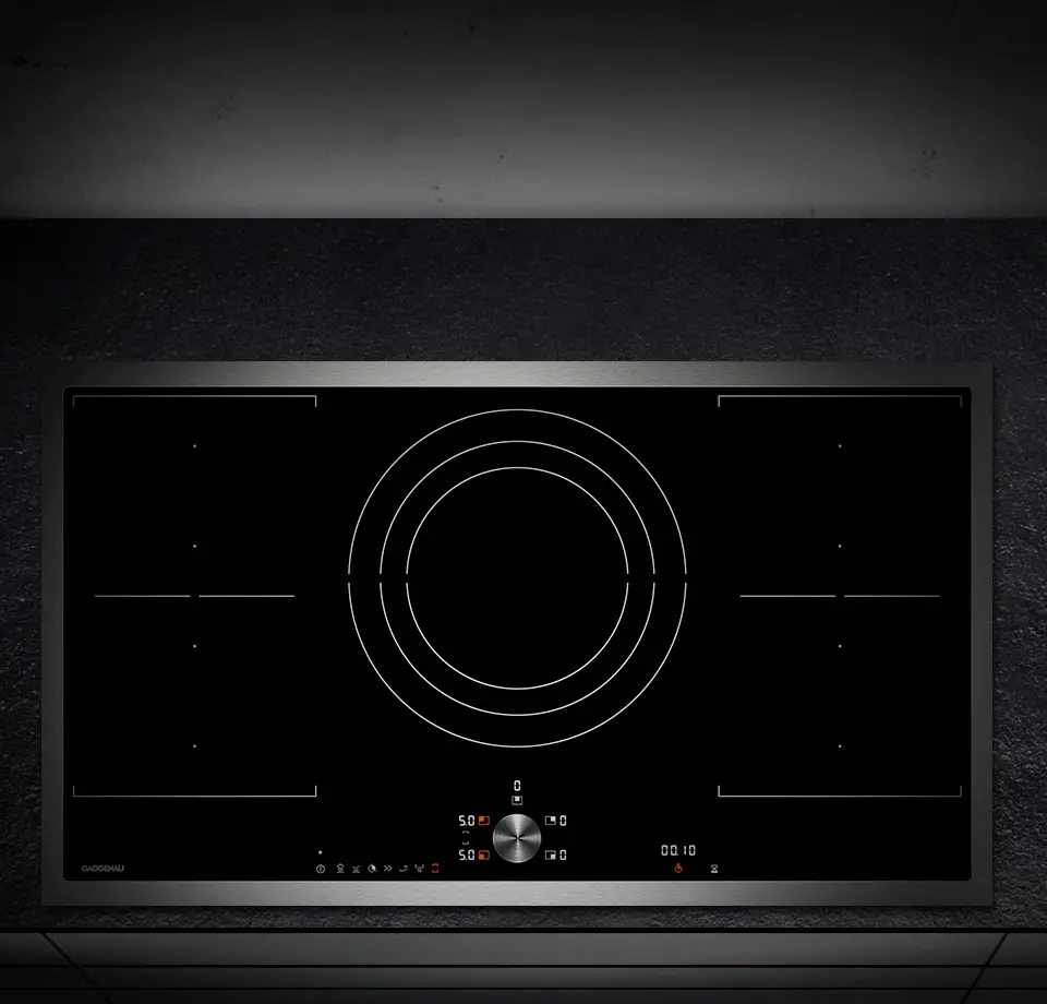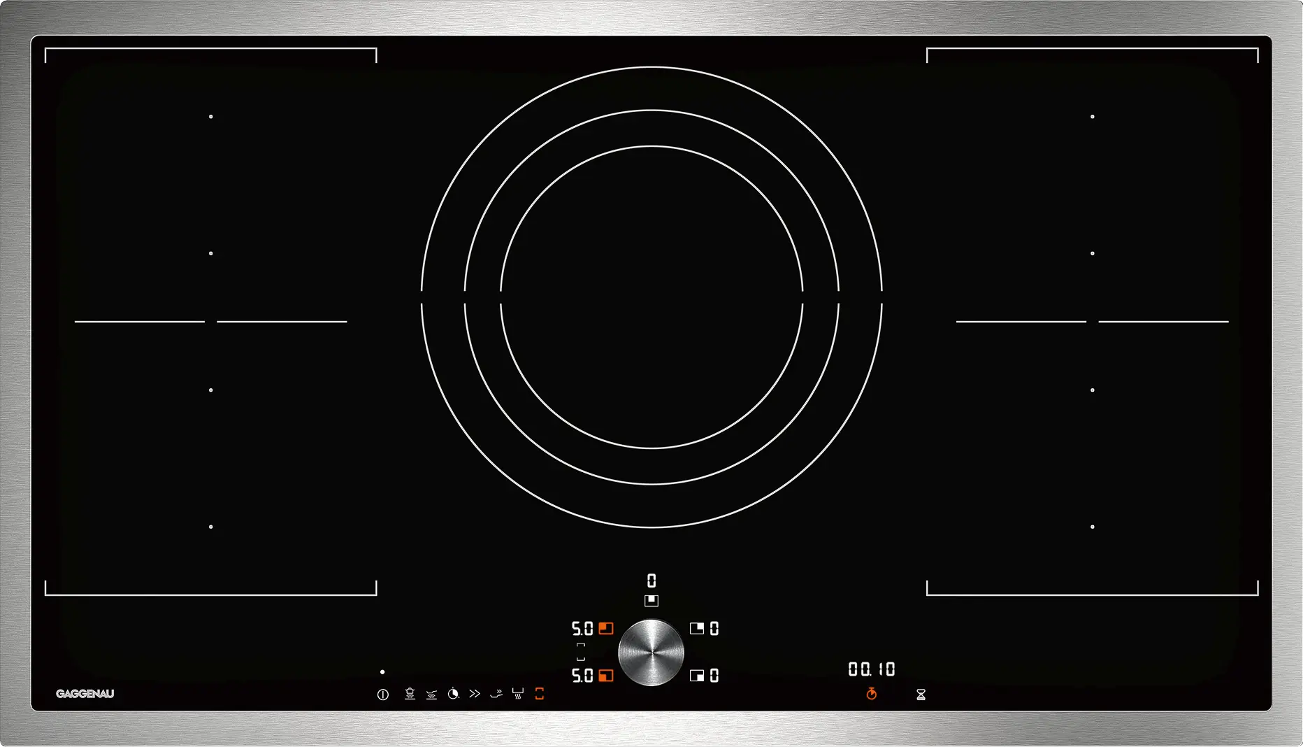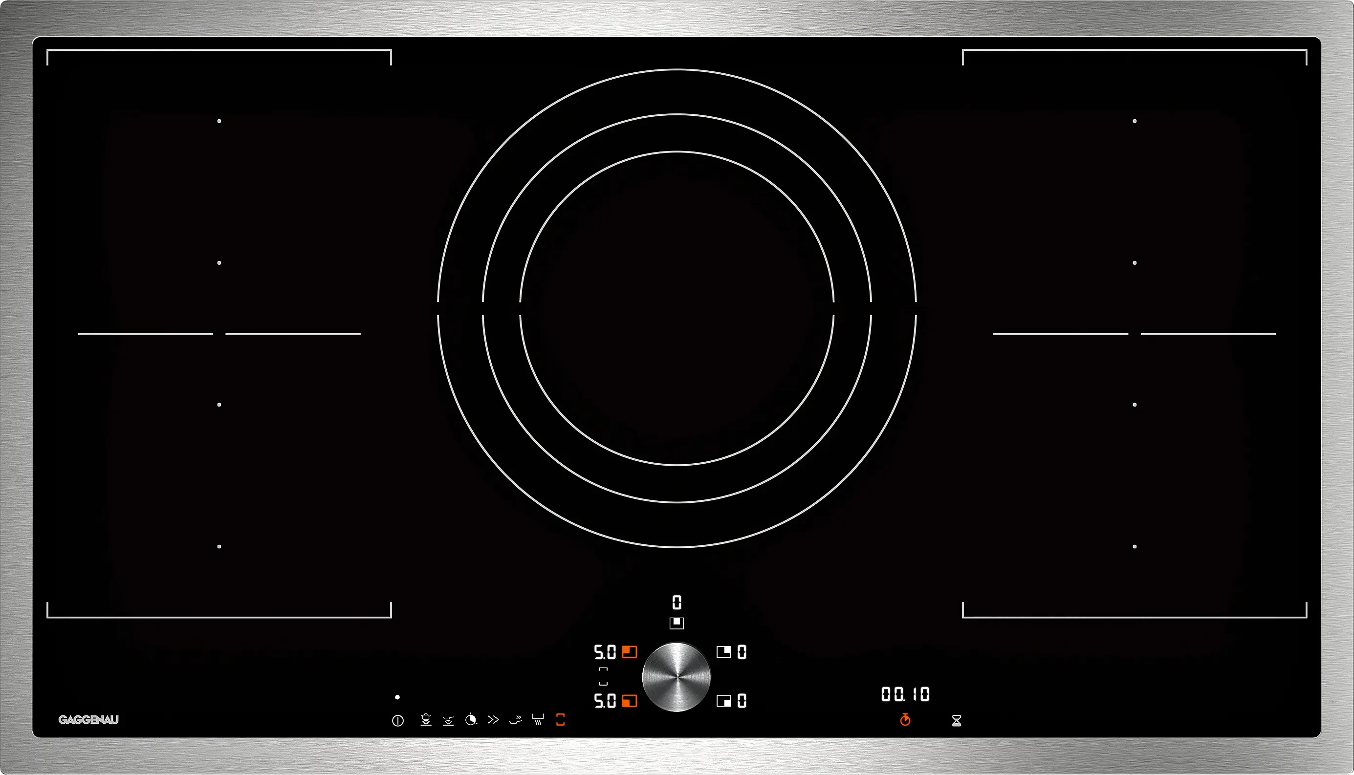 1 induction cooking zone ø 9" (21cm) (2200 W, with booster 3700 W), automatically switches to ø 10" (26cm) (2600 W, with booster 3700 W) and to ø 13" (3300 W, with booster 3700 W).