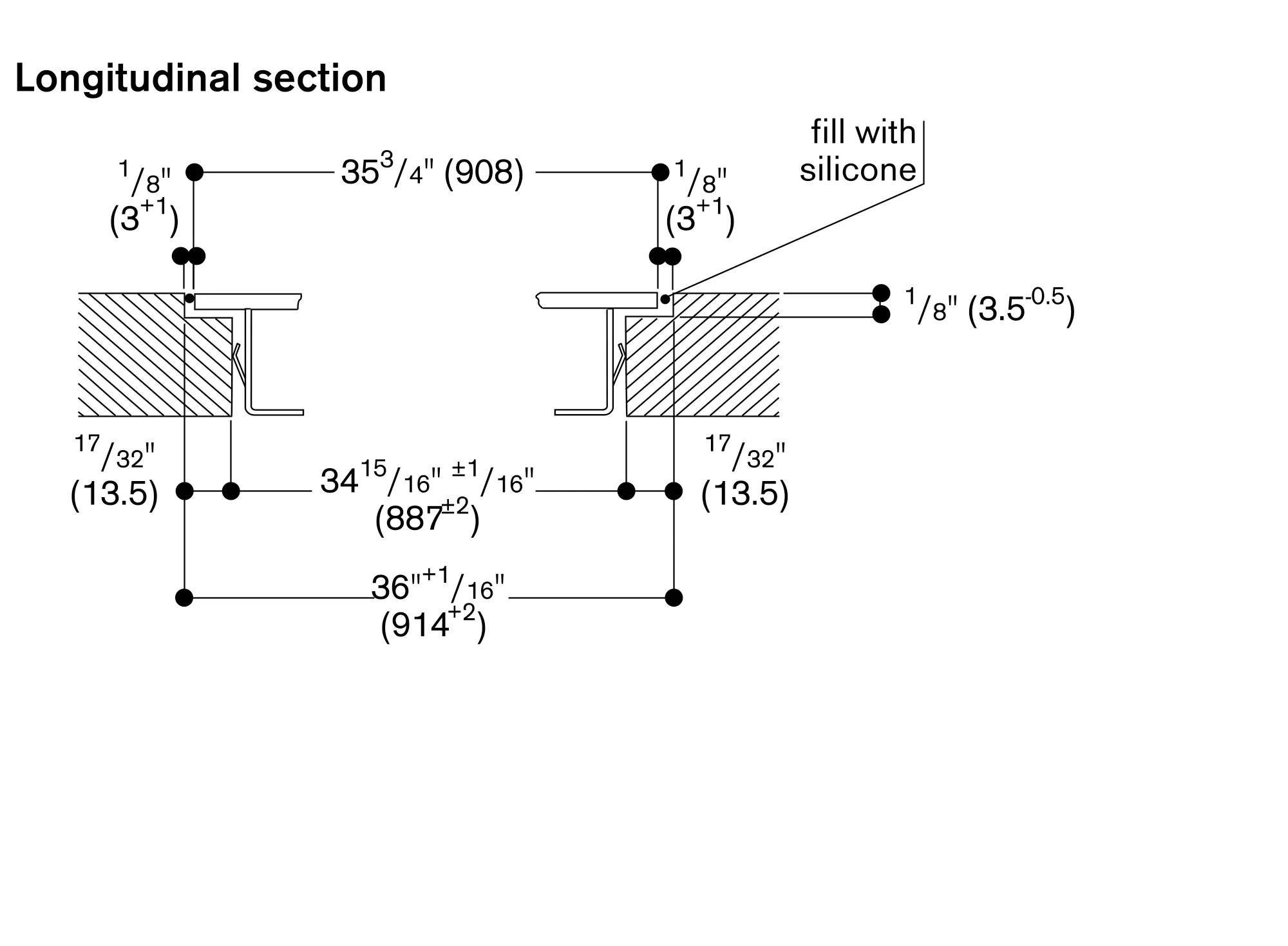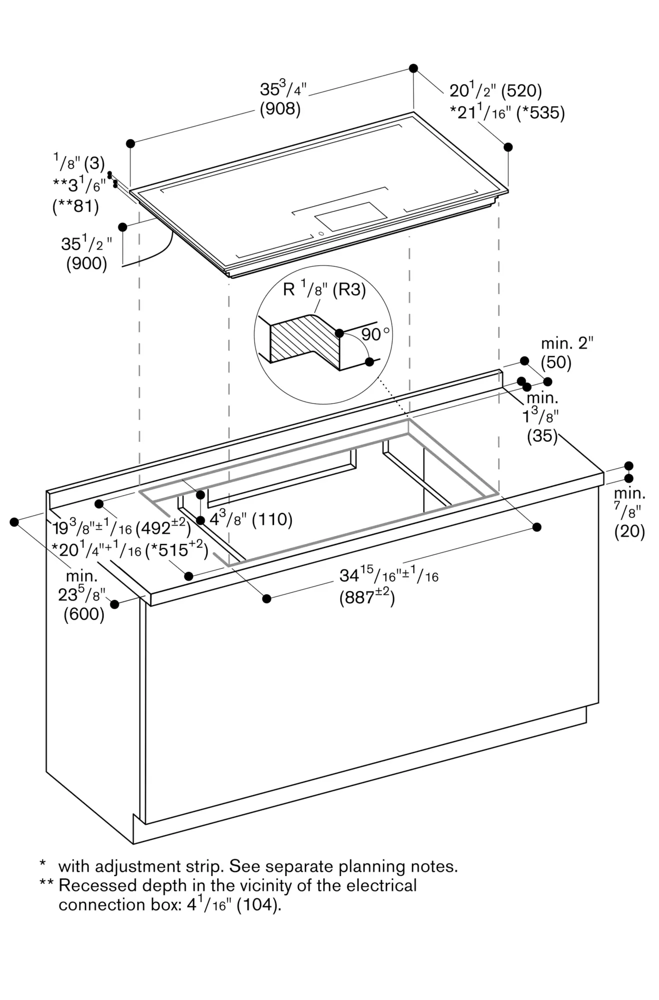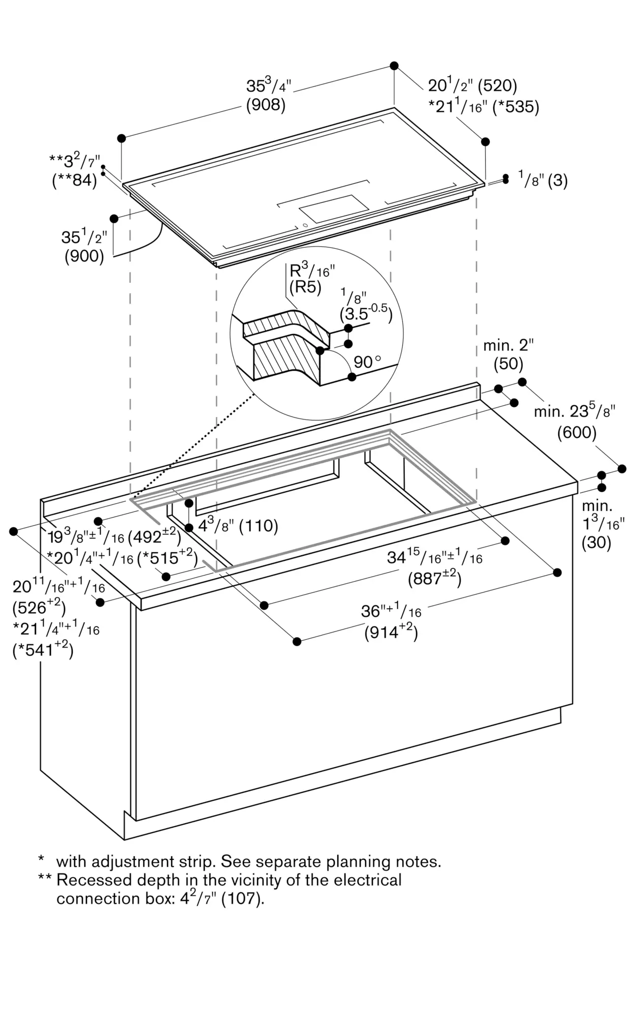 In the cut-out, the installation system requires the side edge to be at least ⅜" (10mm) for surface mounting and at least ½" (13 mm) for flush mounting. Ensure a continuous cut surface of 90°.