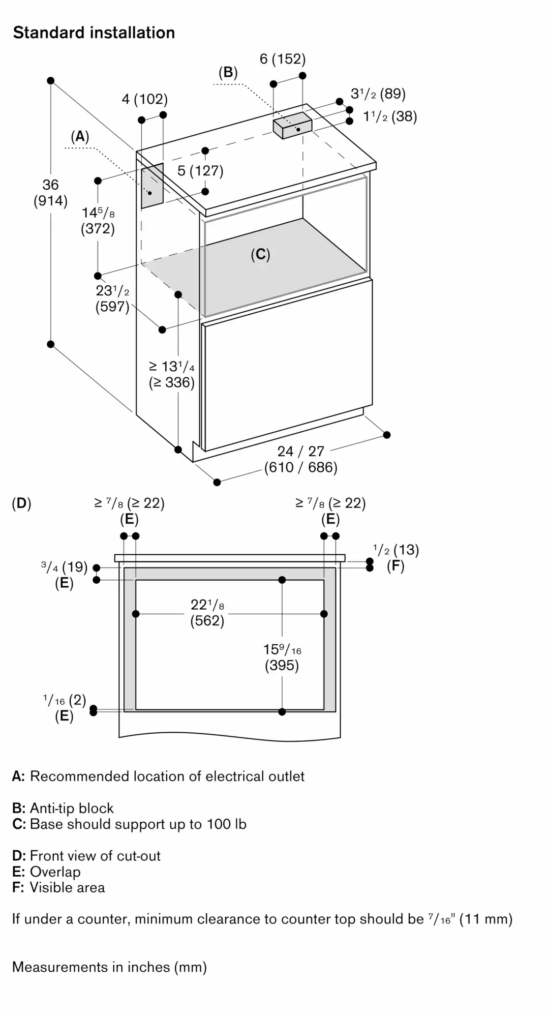 The built-in microwave drawer can be installed using a standard or flush (inset) installation (see adjacent drawings).