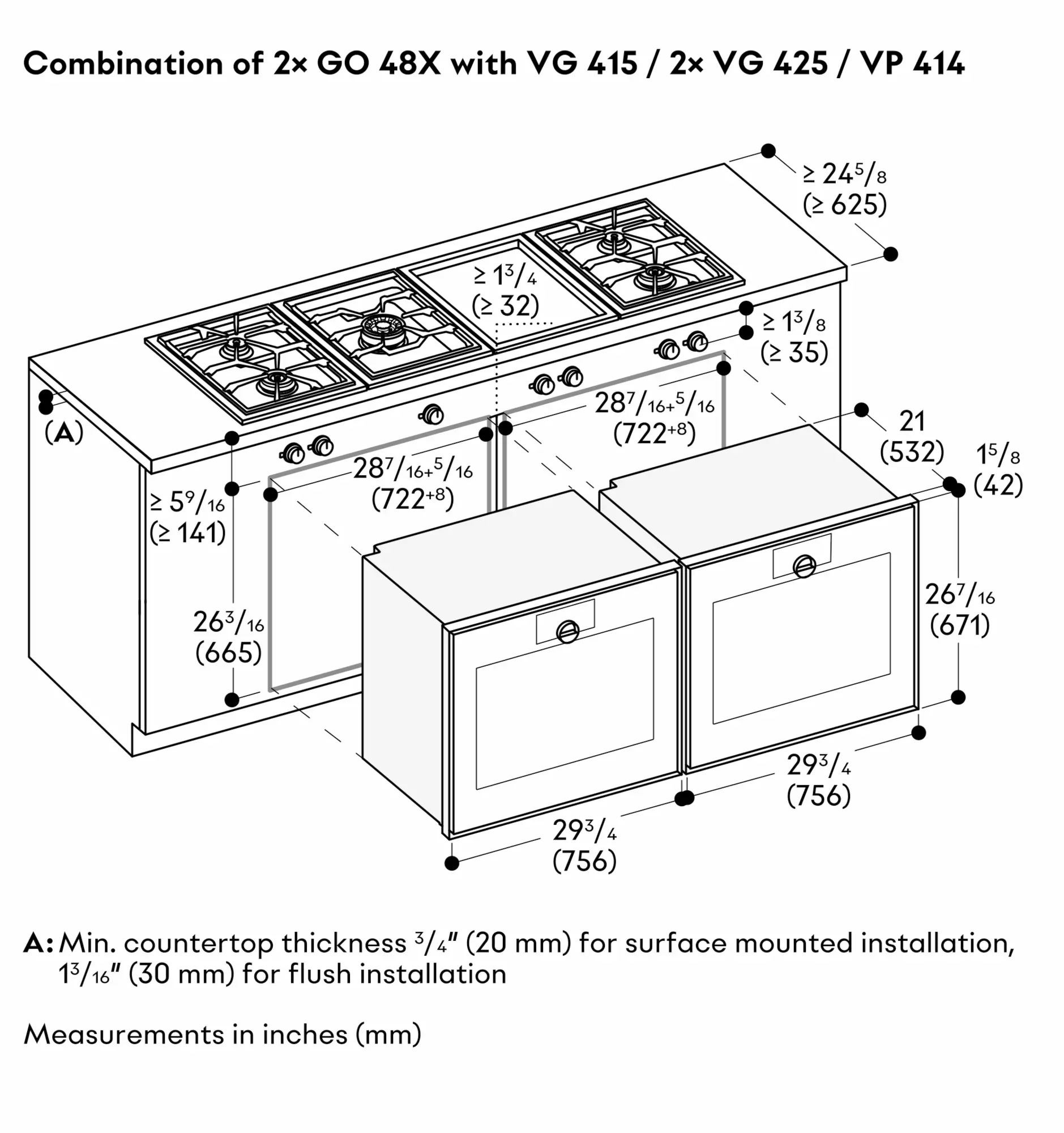 For installation underneath cooktops: distance between the underside of the cooktop and the top edge of the oven housing: min. 9/16" (15 mm). The planning notes for the cooktops (particularly regarding ventilation, gas/electric connection) must be taken into