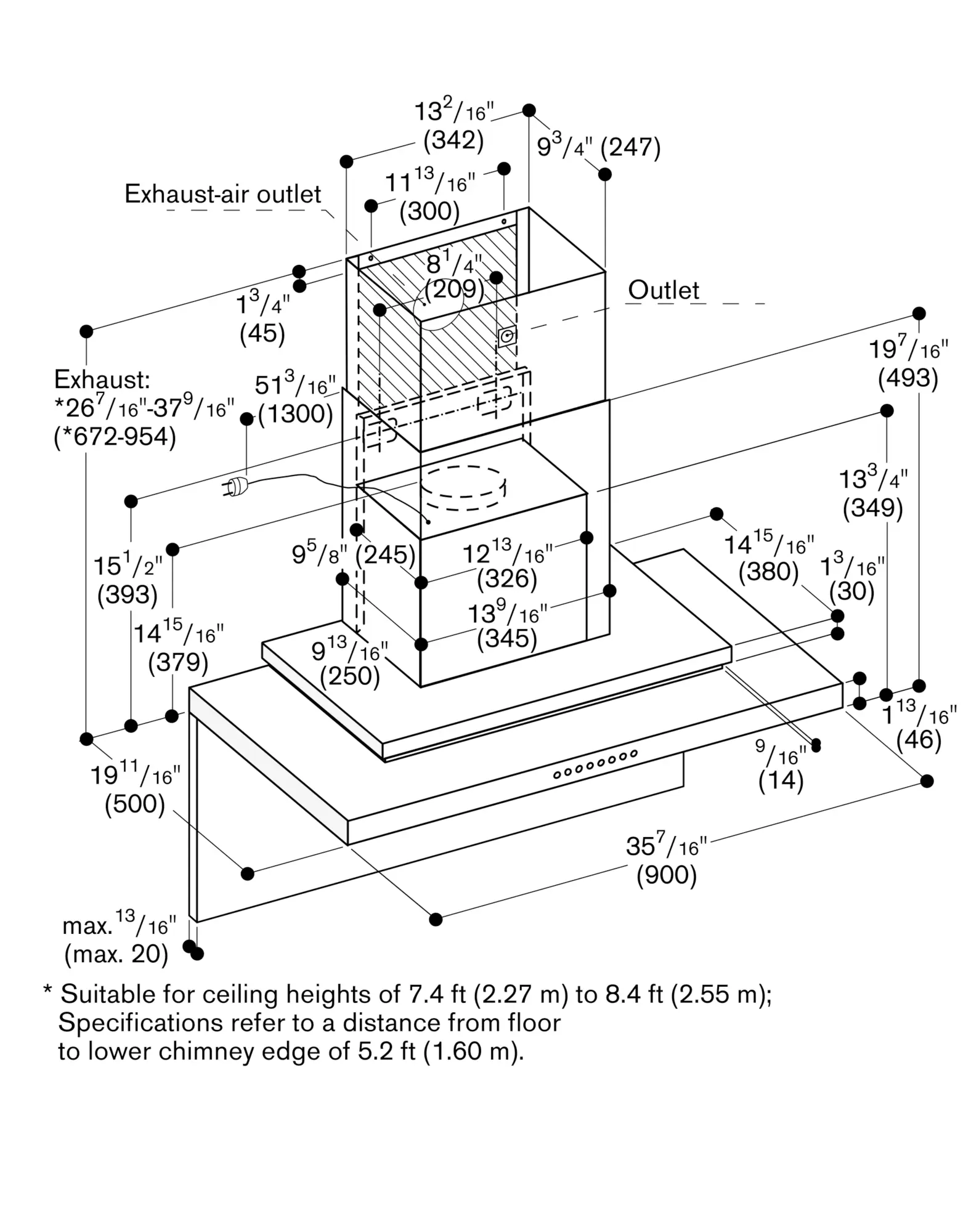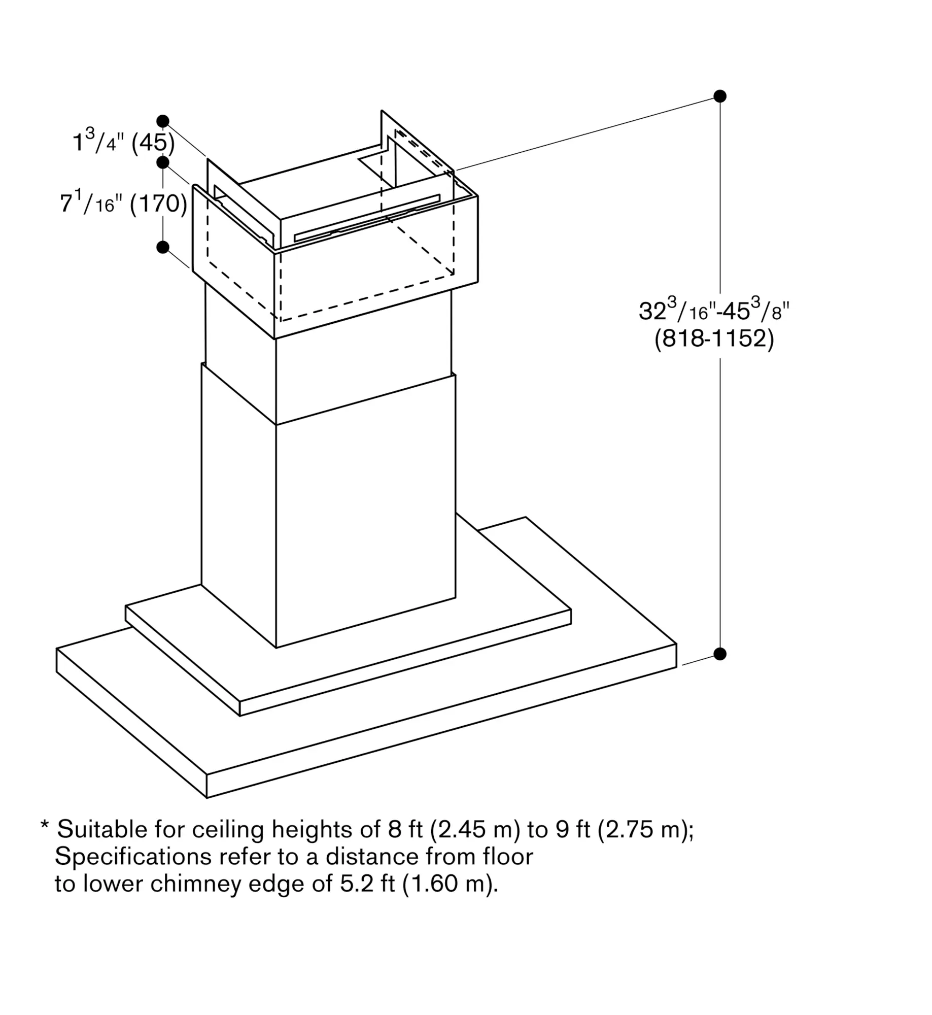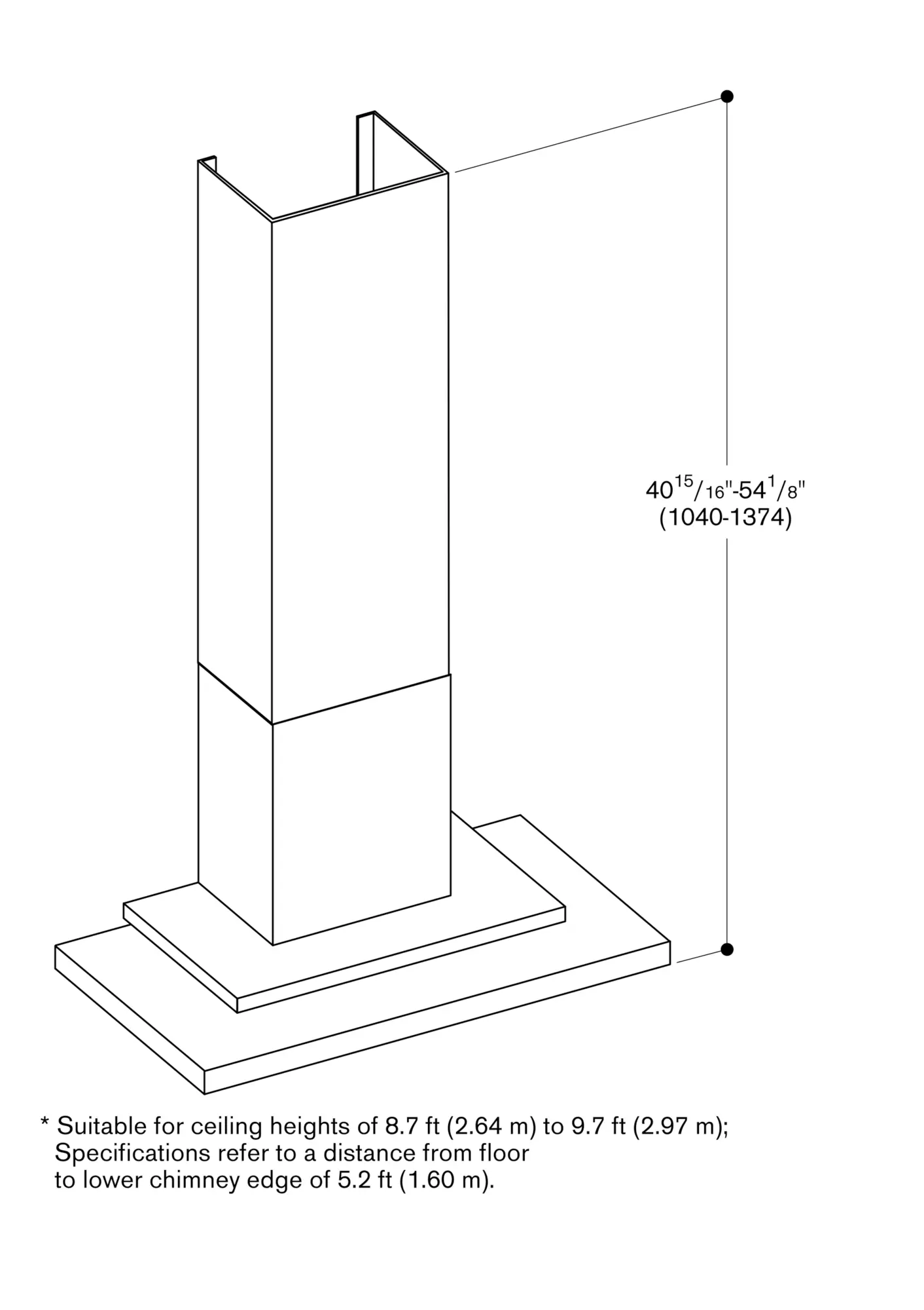 The package includes the two-part chimney with the dimensions from 2' 1 3/4" (654 mm) to 2' 8 13/16" (834 mm). Individual planning solutions can be implemented using the special accessory chimney extension AD 200 322 or by shortening the lower edge of the inner chimney.