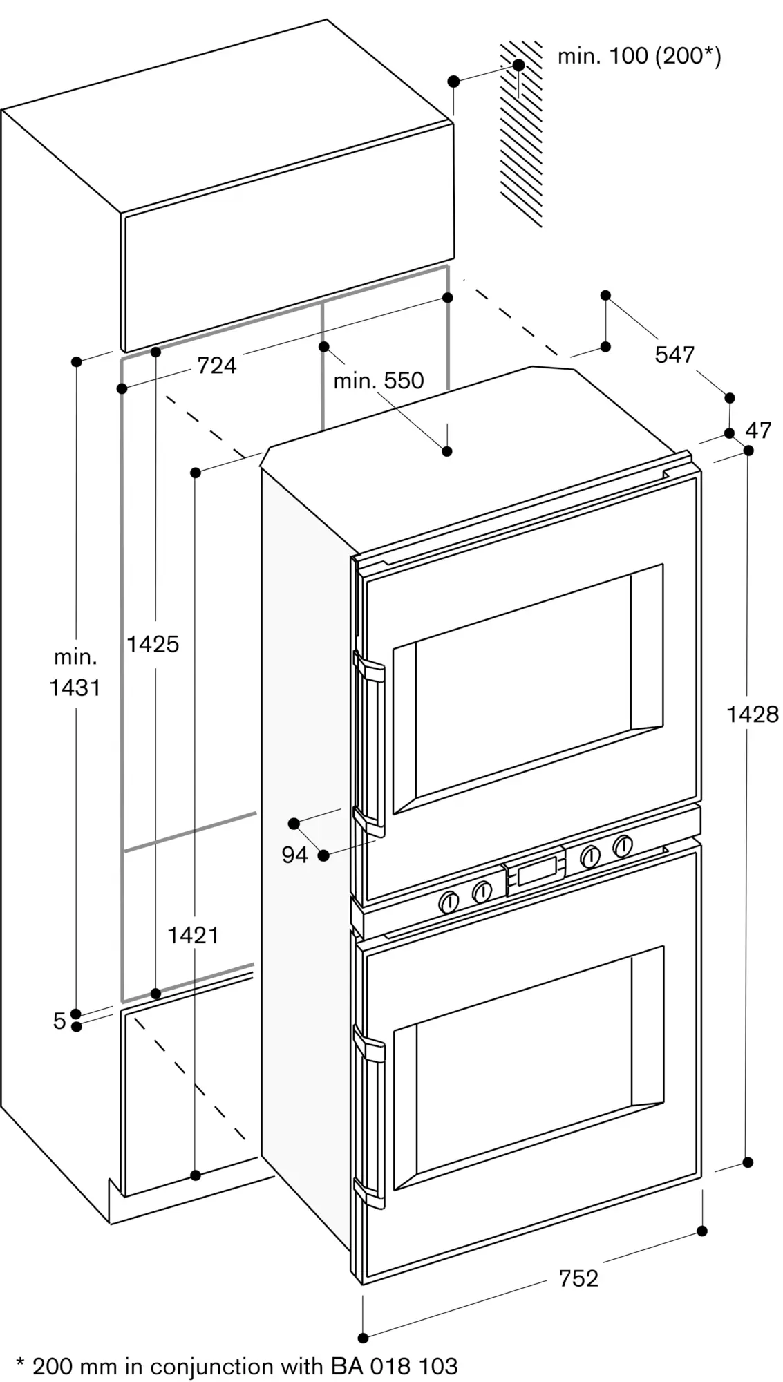 The façade of the appliance extends 47 mm from the furniture cavity.
