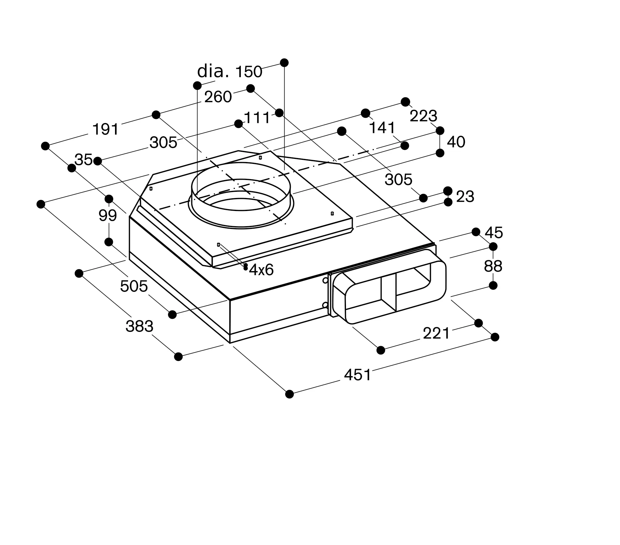 Pipe connection pieces on output side: 1x NW 150 flat duct.